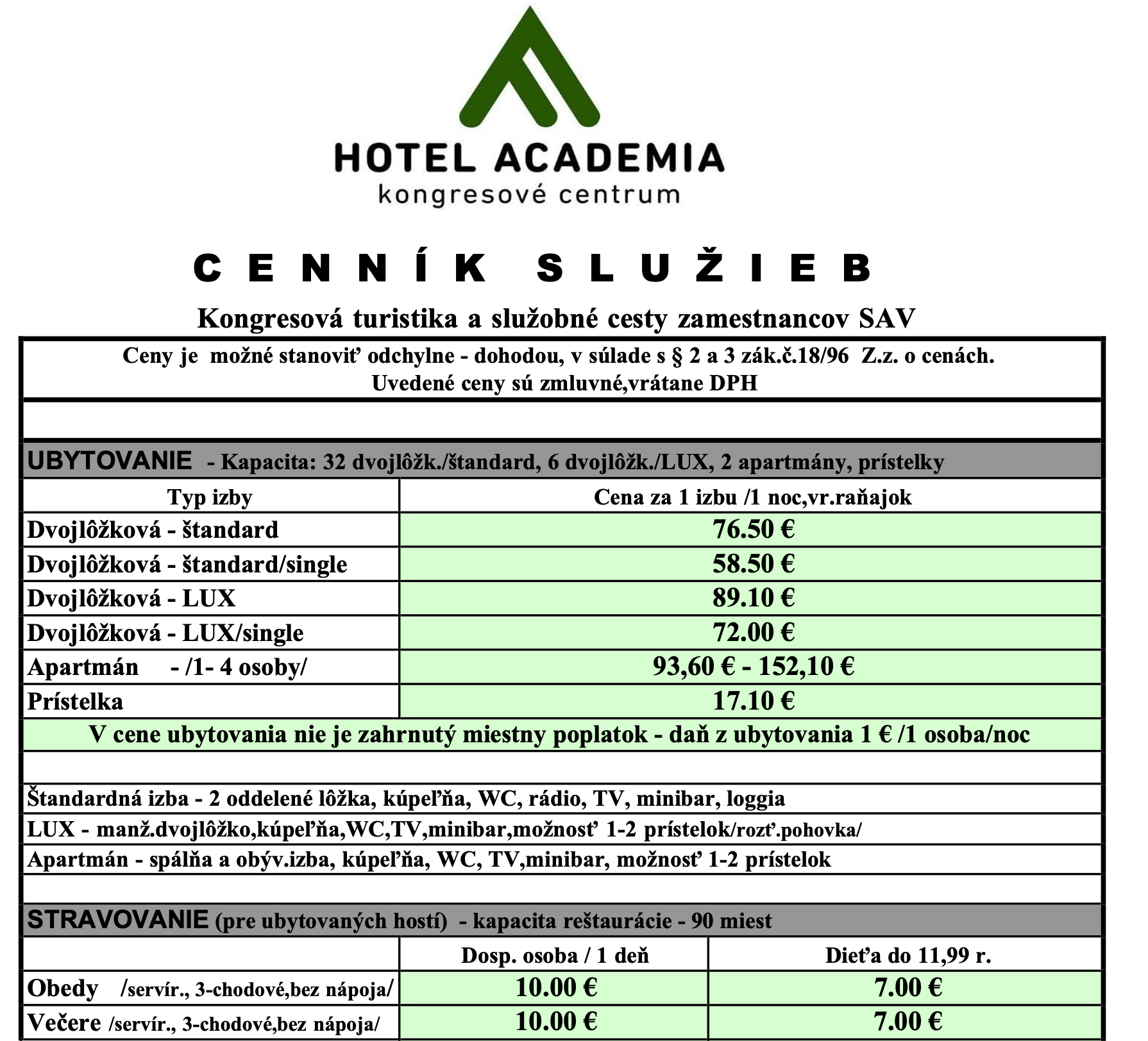 Obedy a večere si účastnící objednávajú aj hradia v Kongresovom centre SAV Academia sami. Raňajky sú pre ubytovaných účastíkov v cene ubytovania.